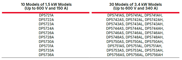 La série DP5700 comprend 40 modèles programmables à sortie unique, avec des unités de 1,5 kW au format demi-rack et de 3,4 kW au format rack complet, toutes deux d'une hauteur de seulement 1U. Elles fournissent une sortie stable avec mesures intégrées de tension et de courant, avec des plages de fonctionnement allant jusqu'à 600 V / 150 A (sur les modèles de 1,5 kW) et 600 V / 340 A (sur les modèles de 3,4 kW).
